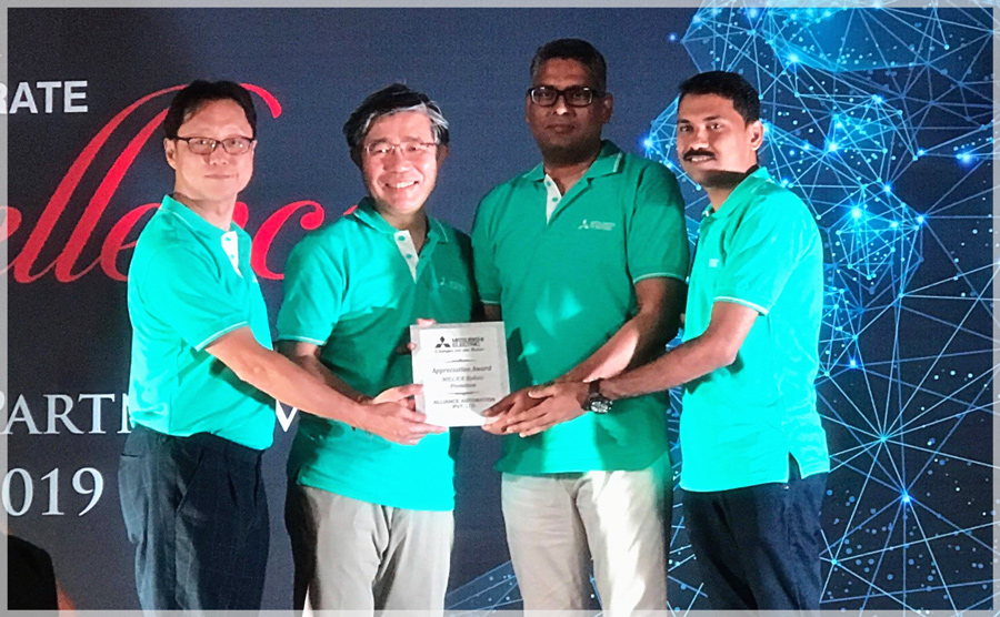 Alliance Automation being felicitated during Alliance partner meet 2019 at Thailand by Mitsubishi Electric FA for MELFA robots promotion. Mr. Pradeep Sharma, MD Alliance Automation. receiving the appriciation award from Mitsubishi Team.